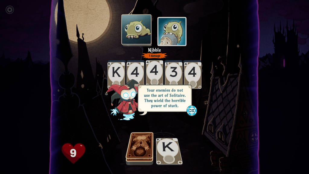 Hmmm. In some regards, this is about as random as these games can get before strategy stops factoring into the outcome at all – that’s inherent to the design of solitaire, though. On the other hand, your runs, or at least the first several battles, will start feeling familiar fast. Surprisingly, the order in which the 17 enemies are presented to you before the final boss doesn’t change. This is presumably done to stop anyone getting too frustrated by getting wiped out before they’ve put a real dent in the run, but after about the fifth encounter or so, you will be at least partly at the mercy of some good luck regardless of your build, and shifting some enemies around would have gone a long way to giving each run its own identity.
