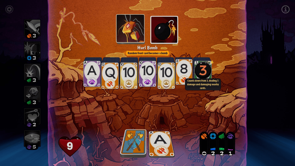 Well… this is an odd one. The game uses a +1/-1 solitaire playing card system, albeit without suits. What am I going to do; tell you that the 6 of hearts is OP or that they need to nerf the queen and jack synergies? Rather than the actual cards, I think I’ll use this space to talk about a few good purchasable spells I found handy, since they more closely resemble the functions of cards in other roguelike deck-builders.