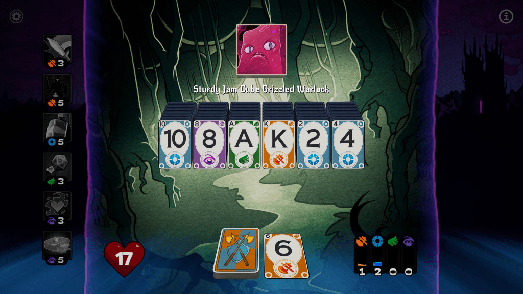 You have some magic at your disposal, and here’s where the game actually qualifies for a post here. Instead of suits, most cards are associated with one of four types of magic – attack, defense, agility, and willpower. Matching an attack card will stockpile one attack energy, which can be saved up and spent on attack spells, which do things like match any one card regardless of what number you currently have, remove all cards of a particular number, and so on. However, you can only have six spells at a time, with new ones being a big drain on the coins you win between rounds, and this is where the bulk of strategy lies. Losing a run loses you everything, except for some gems that can be redeemed to unlock new ‘classes’ (really just different spell type focuses), or extra passive abilities and items for classes you already have.